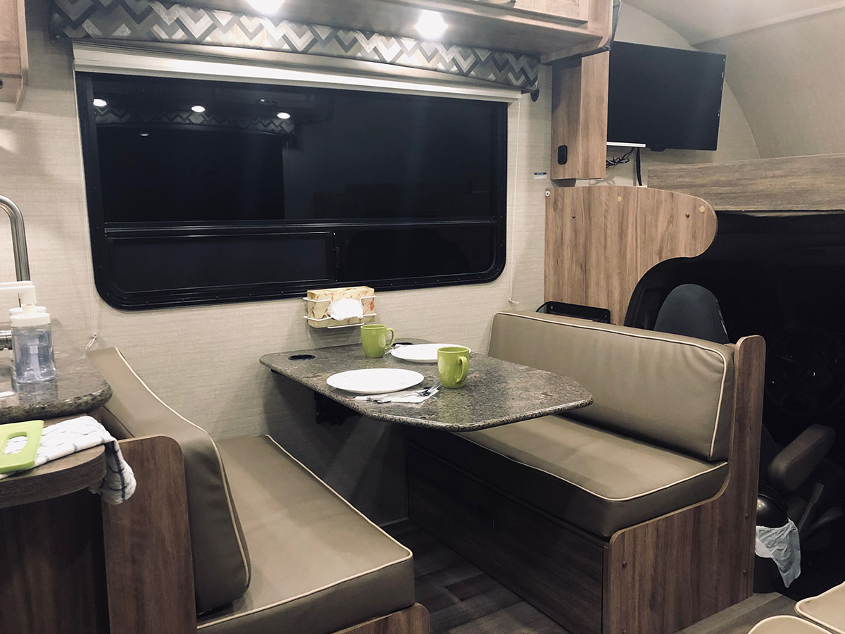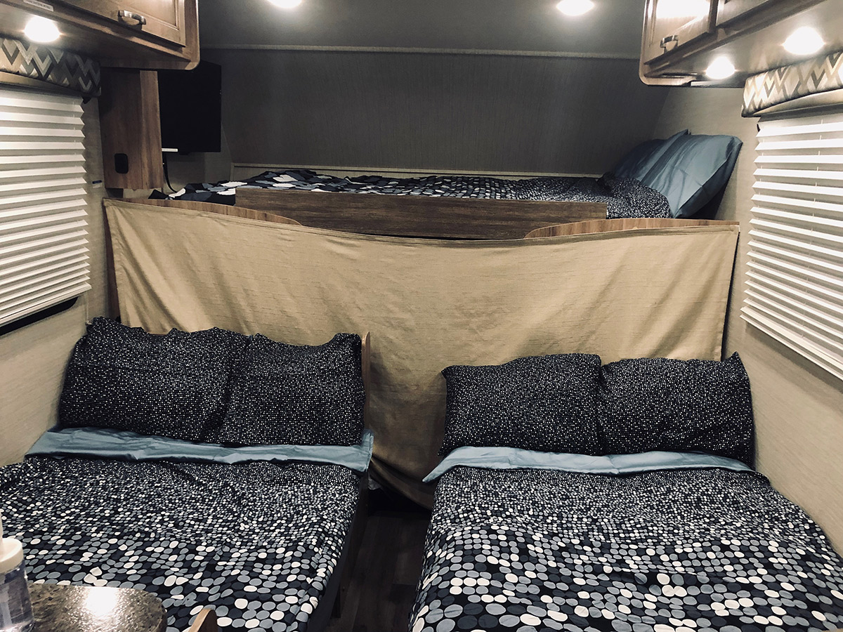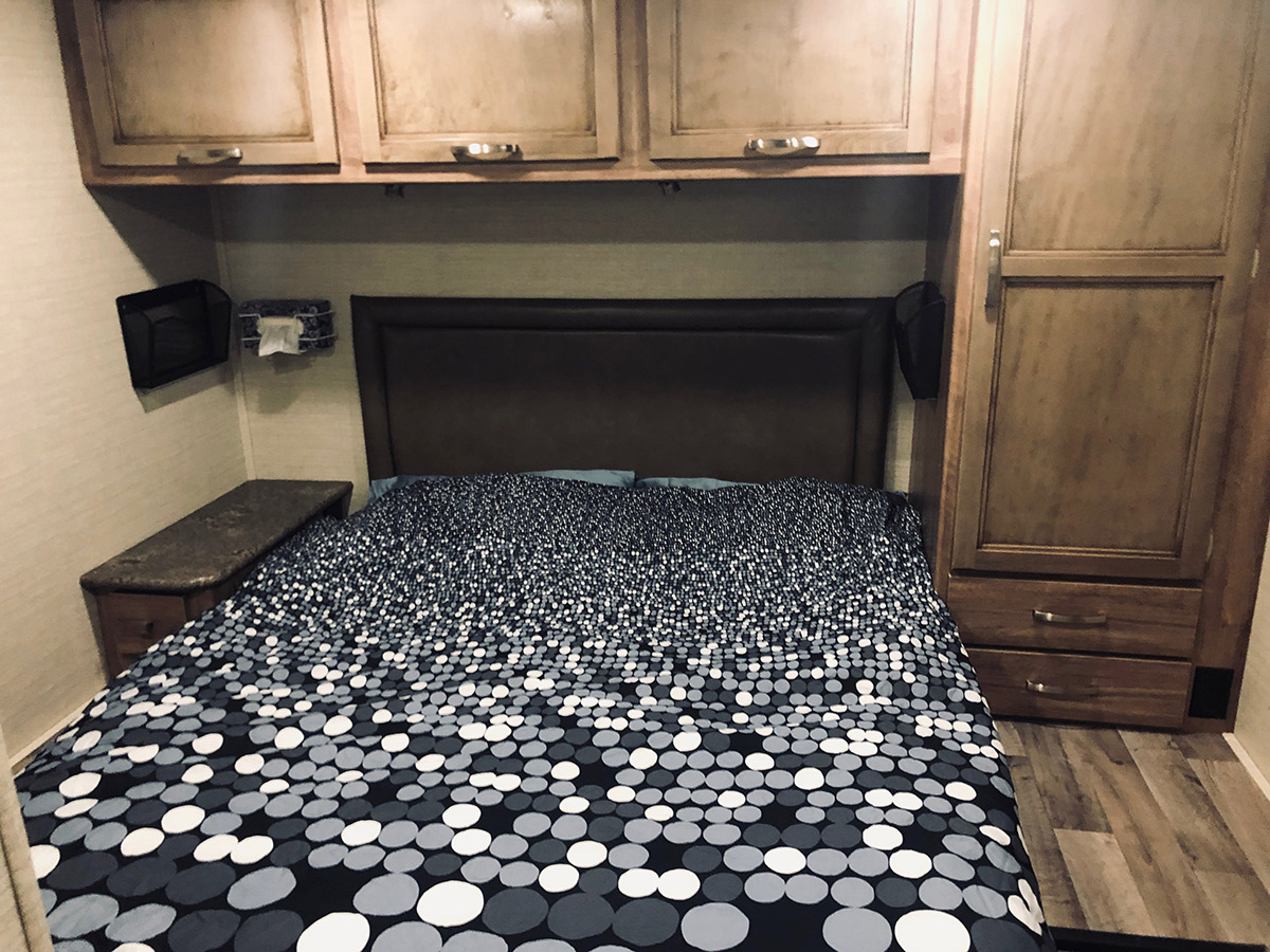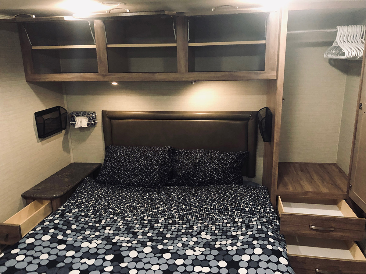 Gallery Front Exterior Exterior Awning Dashboard Fuel Consumption Kitchen Kitchen & Dining Dinette Dinette Storage Interior Storage Interior Storage Range and Convection Microwave 2-Burner Gas Range Kitchen Storage Kitchen Storage Fridge Fridge Interior Complementary Spice Rack Fully-equipped Kitchen Privacy Door to Bedroom Bathroom Shower Complimentary Toiletries Master Bedroom Master Bedroom Storage Sleeping Area Bunk Safety Rail Thermostat Pull-through Storage Pull-through Storage Exterior Storage Exterior Storage